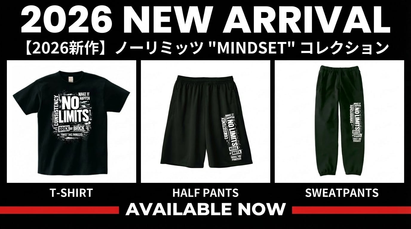 【2026新作】ノーリミッツ "MINDSET" スウェットパンツ。 結果を出すための「思考」を纏え 【注意】 ※この商品は、最短で〇月〇日(〇)にお届けします(お届け先によって、最短到着日に数日追加される場合があります)。というような表記がありますが、こちらはシステム上表示されてしまうものです。 こちらの商品は予約販売となります。予約受付は1月31日(土)18時までとなっております。 商品の発送は2月中旬以降から順次発送となります。ご了承のほどよろしくお願いします。 【商品紹介】 強くなるために必要なのは、優れたフォームやプログラムだけではありません。最も重要なのは、それに取り組む「心構え(マインドセット)」です。 2026年の新作となるこの一枚は、従来のイラスト中心のスタイルを一新。 ストリート感溢れるモダンなタイポグラフィデザインに、ノーリミッツが提唱する「強者の思考様式」を刻み込みました。 デザインの中心に据えたのは、揺るぎない信念である "NO LIMITS"。 その周囲には、限界を超えるために不可欠な4つのマインドセットが配置されています。 【デザインに込められた5つのマインドセット】 NO LIMITS(限界はない) すべての中心にある核。自分自身で勝手に限界を決めないこと。 CONSISTENCY(継続は力なり) 派手なことよりも、地味な継続こそが最強の才能です。日々の積み重ねを止めない強い意志を表現。 MAKE IT HAPPEN(自ら実現させる) 「できたらいいな」という願望ではなく、「やる」という決意。自らの行動で結果を掴み取る姿勢です。 BRICK BY BRICK(レンガを積むようにコツコツと) 近道はありません。一つひとつのレンガ(努力)を丁寧に積み上げた先にしか、巨大な城(記録)は完成しません。 TRUST THE PROCESS(プロセスを信じ抜く) 今日の結果に一喜一憂しないこと。正しい理論と計画に基づいた「過程」を信じ、迷わず突き進むメンタリティです。 ジムでのハードなワークアウトにはもちろん、タウンユースとしても映えるスタイリッシュな一枚。 このスウェットパンツを履くことは、これらの「マインドセット」を常に意識し、実践するという自分自身への宣言です。 強くなりたいすべてのトレーニーへ! 迷った時、背中を押してくれる「思考」を手に入れてください。 選べるカラーは全3色! ブラック / ネイビー / グレー サイズ展開も豊富 S~3XLまで、幅広くご用意しております。 ※詳細はサイズ表をご確認ください。 スウェットパンツのボディは9.7oz Printstar(プリントスター)00186-NSPです。 スタンダードな形で適度な厚みがあり、オールシーズン履けます。